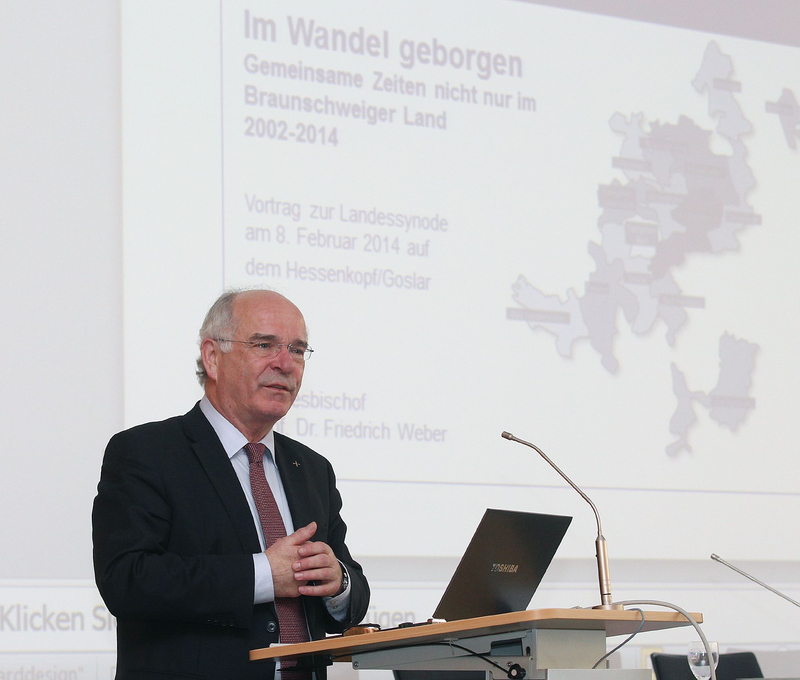 Goslar. Mit stehenden Ovationen hat die braunschweigische Landessynode am 8. Februar in Goslar Landesbischof Friedrich Weber verabschiedet. Der Landesbischof geht im Mai mit 65 Jahren in den Ruhestand; es war seine letzte Synodentagung. Der frühere langjährige Synodenpräsident Gerhard Eckels (Braunschweig) attestierte Weber in einer Laudatio, dass er sich „in hohem Maße" um die Landeskirche verdient gemacht habe.