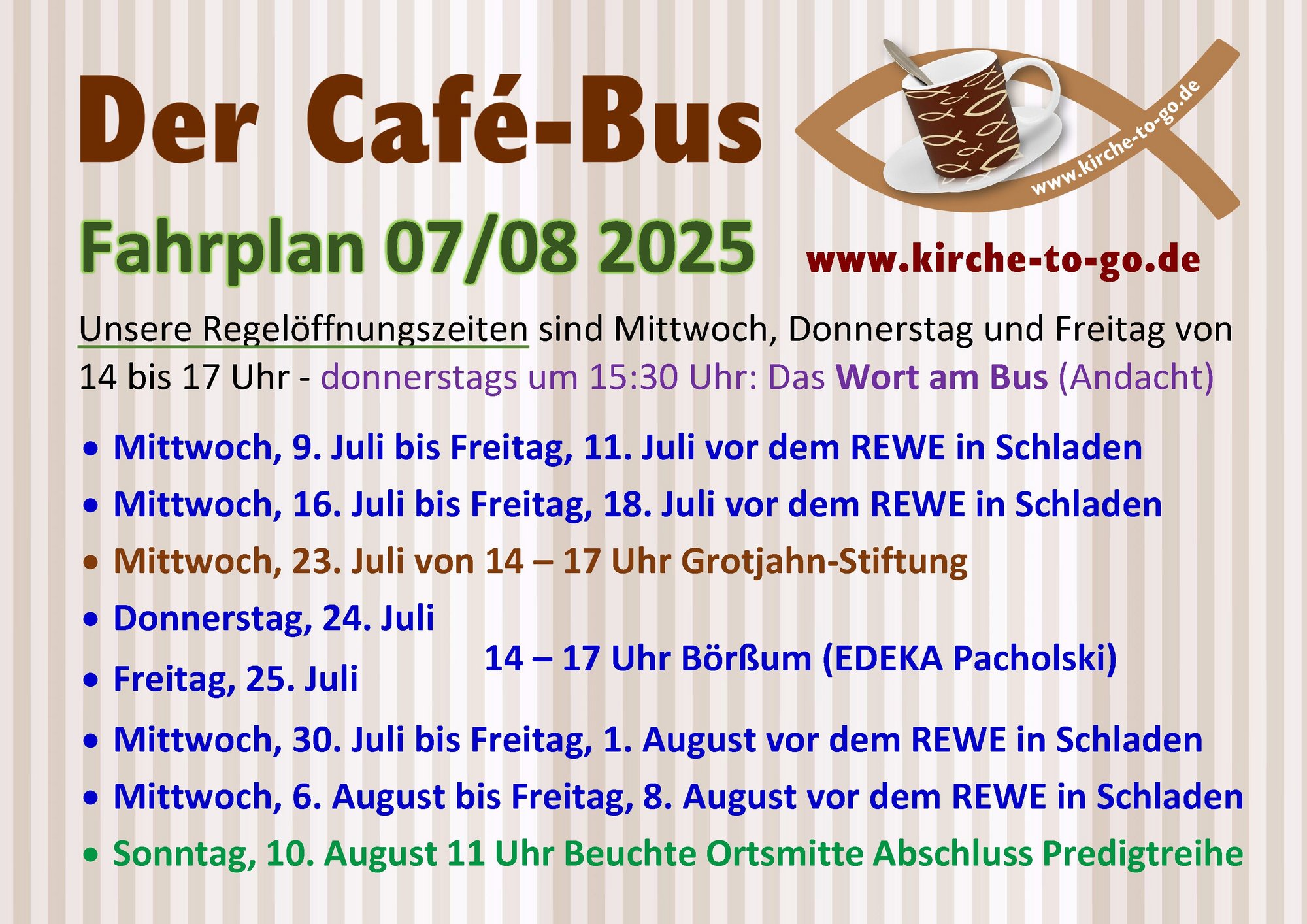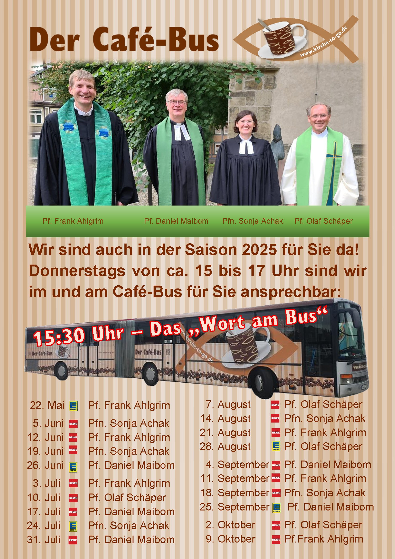 Die Pfarrerschaft wird regelmäßig donnerstags im und am Café-Bus anwesend sein.